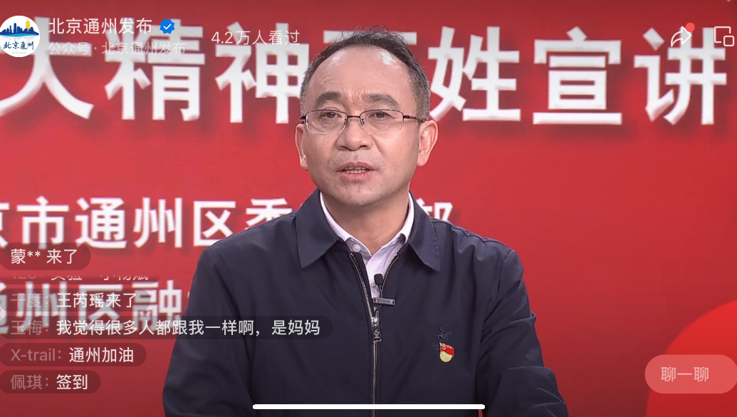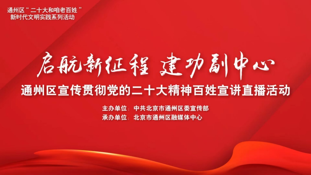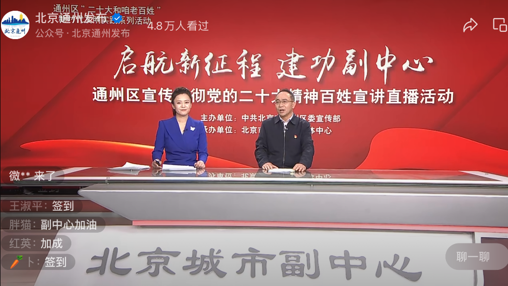通州区“二十大和咱老百姓”新时代文明实践系列活动——“启航新征程 建功副中心”通州区学习宣传贯彻党的二十大精神百姓宣讲直播活动采取“专家解读+百姓宣讲”的全新模式,以学习宣传贯彻党的二十大精神为契机,持续深化校地合作,推动交流纵深发展,Beat365中文官方网站发挥好二十大精神学习研究先锋作用,推动党的创新理论“飞入寻常百姓家”。高正礼教授结合通州城市副中心的生动实践对党的二十大精神进行深度解读,讲出了政治高度和理论深度。 目前视频号观看人数10.9万人次,微博观看人数122万人次。