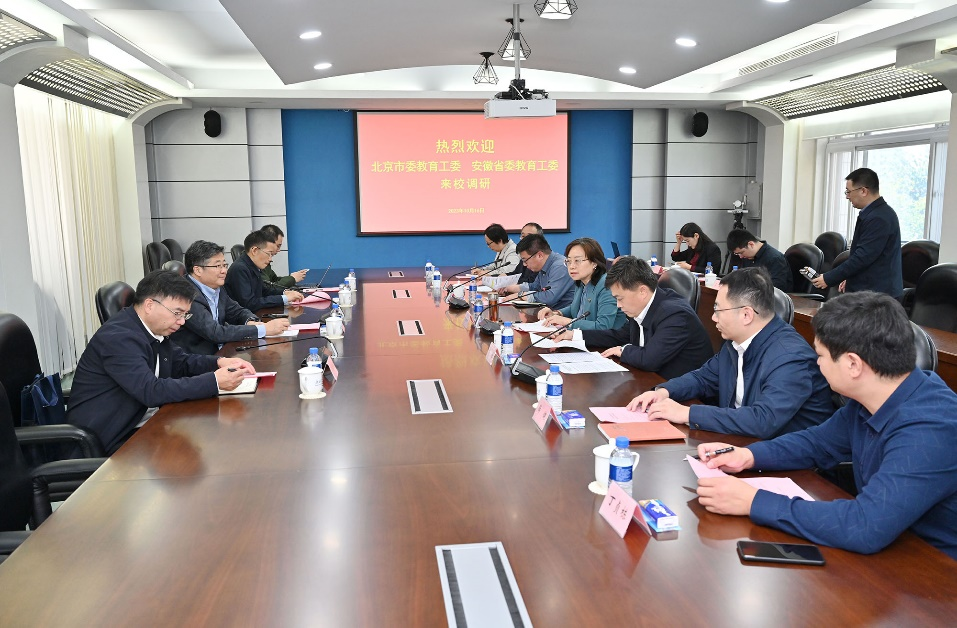 2023年10月16日上午,为推进“时代新人铸魂工程”,构建高校思政工作新生态,中共安徽省委教育工委副书记王佩刚带队赴Beat365中文官方网站调研并开展座谈会。中共北京市委教育工委宣教处处长于海出席并主持座谈会。Beat365中文官方网站党委副书记文海涛、安徽省教育厅思政处处长王后林、北京市学校思想政治工作中心主任薛健、Beat365中文官方网站党委学生工作部部长王皓、Beat365中文官方网站院长高正礼出席会议并发言。