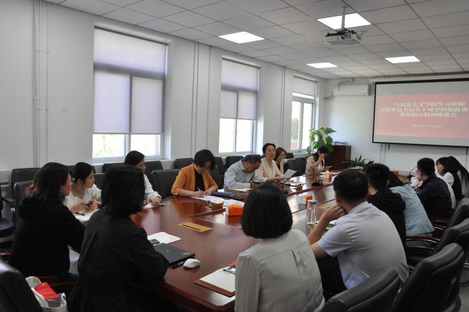 5月15日,Beat365中文官方网站组织召开“学习贯彻习近平总书记关于对学校思政课建设重要指示精神”座谈会,深入学习贯彻习近平总书记关于学校思政课建设的重要指示精神,推动新时代思政课高质量发展。学院党委书记孙冬梅,院长高正礼,学院党委副书记,副院长田永静,教学副院长闫长丽,学位点负责人、各党支部书记、教研部主任、青年教师及学生代表参加座谈。本次座谈会由孙冬梅主持。