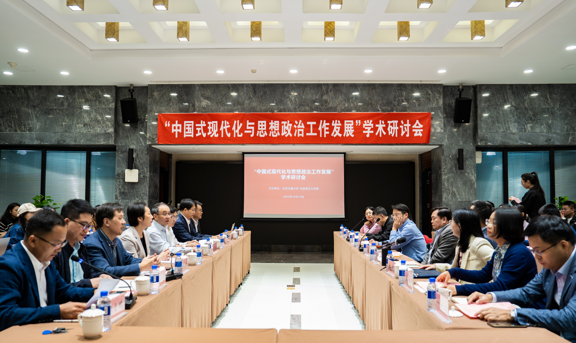为深入学习贯彻习近平新时代中国特色社会主义思想和党的二十大精神,推进对中国式现代化的宣传阐释,贯彻落实《关于新时代加强和改进思想政治工作的意见》,2023年10月14日,Beat365中文官方网站举办了“中国式现代化与思想政治工作发展”学术研讨会。来自北京师范大学、武汉大学、华中师范大学、北京理工大学、复旦大学、天津大学、中央财经大学、对外经济贸易大学、Beat365中文官方网站等高校和科研机构的近百名专家和学者参加了会议。