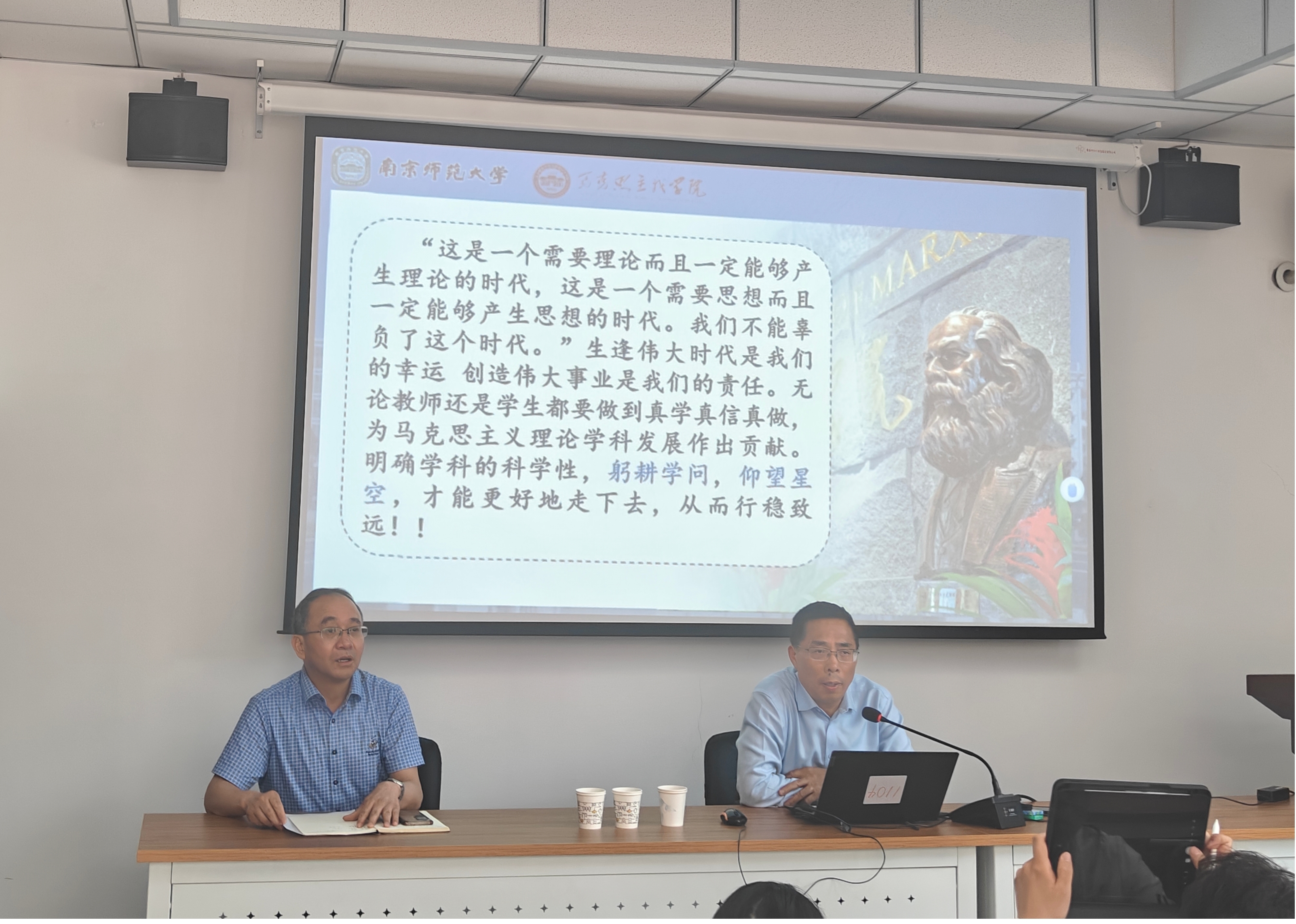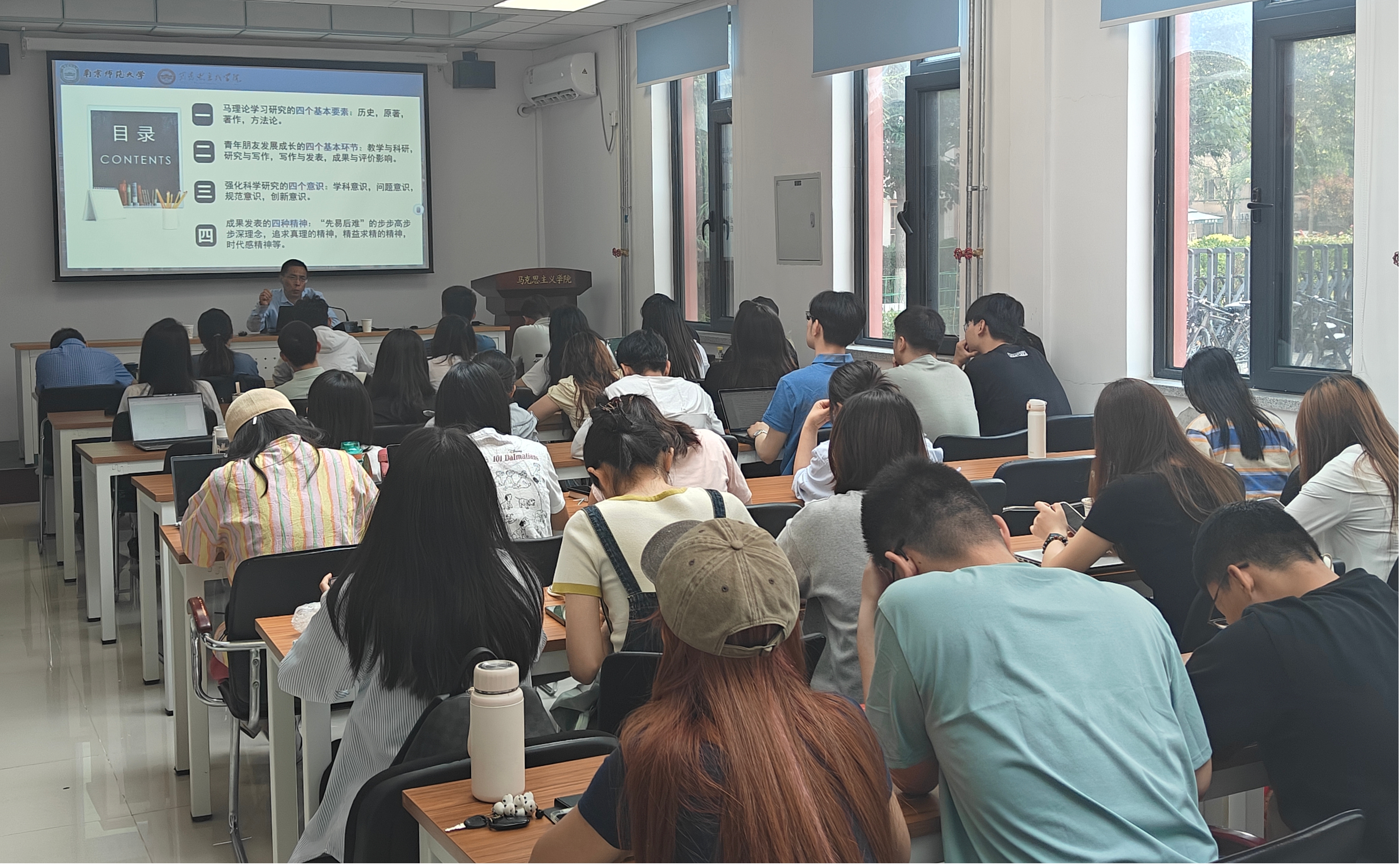 王永贵教授主要从四个“四”展开论述。首先,王永贵教授指出马克思主义理论学习研究应围绕学历史、学原著、读著作、懂方法四个基本要素展开。要学历史,了解马克思主义理论发展、变化、传播的历程;要学原著,从经典中准确把握原理;要读著作,读代表性和综合性著作;要懂方法,只有掌握科学方法才能更好地学习马克思列宁主义。其次,王永贵教授从自身科研经历出发,结合马克思主义理论的学科特色,总结出青年发展需要注意教学和科研、研究与写作、写作与发展、成果与评价四个基本环节。再次,王永贵教授提出科学研究要加强学科意识,做到在马言马、在马学马、在马讲马,在打好基础的层次上有意加强方法的突破;要加强问题意识,按照“话题-问题-课题”的思路来进行写作;要加强规范意识,规范是引领学科发展的明灯;要加强创新意识,从研究的角度、方法、切入点、思路以及呈现方式等方面进行创新。最后,王永贵教授指出生逢伟大时代是我们的幸运,创造伟大事业是我们的责任。无论教师还是学生都要心怀“先易后难”的步步高步步深理念,敢于追求真理、探寻真理,躬身学问、精益求精,立足时代、投身实践,从而行稳致远。